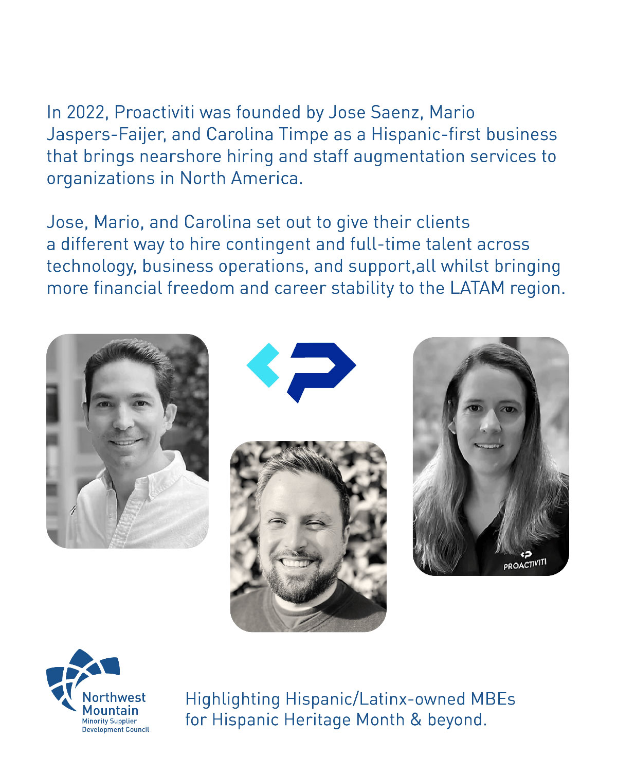 In 2022, Proactiviti was founded by Jose Saenz, Mario Jaspers-Faijer, and Carolina Timpe as a hispanic-first business that brings nearshore hiring and staff augmentation services to organizations in North America.Jose, Mario, and Carolina set out to give their clients a different way to hire contingent and full-time talent across technology, business operations, and support, all whilst bringing more financial freedom financial freedom and career stability to the LATAM region.
